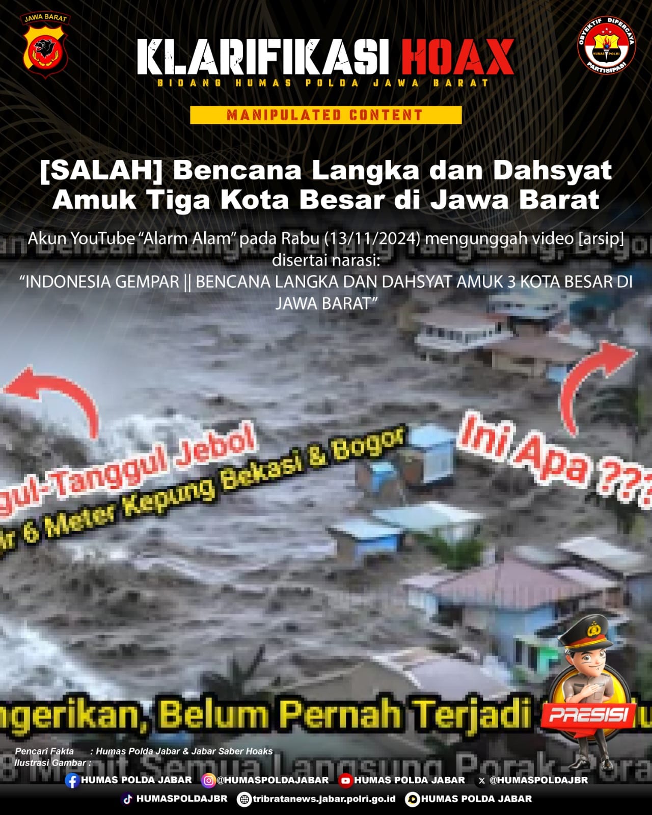 Video dengan narasi “bencana langka dan dahsyat amuk tiga kota besar di Jawa Barat” merupakan konten yang dimanipulasi (manipulated content).
