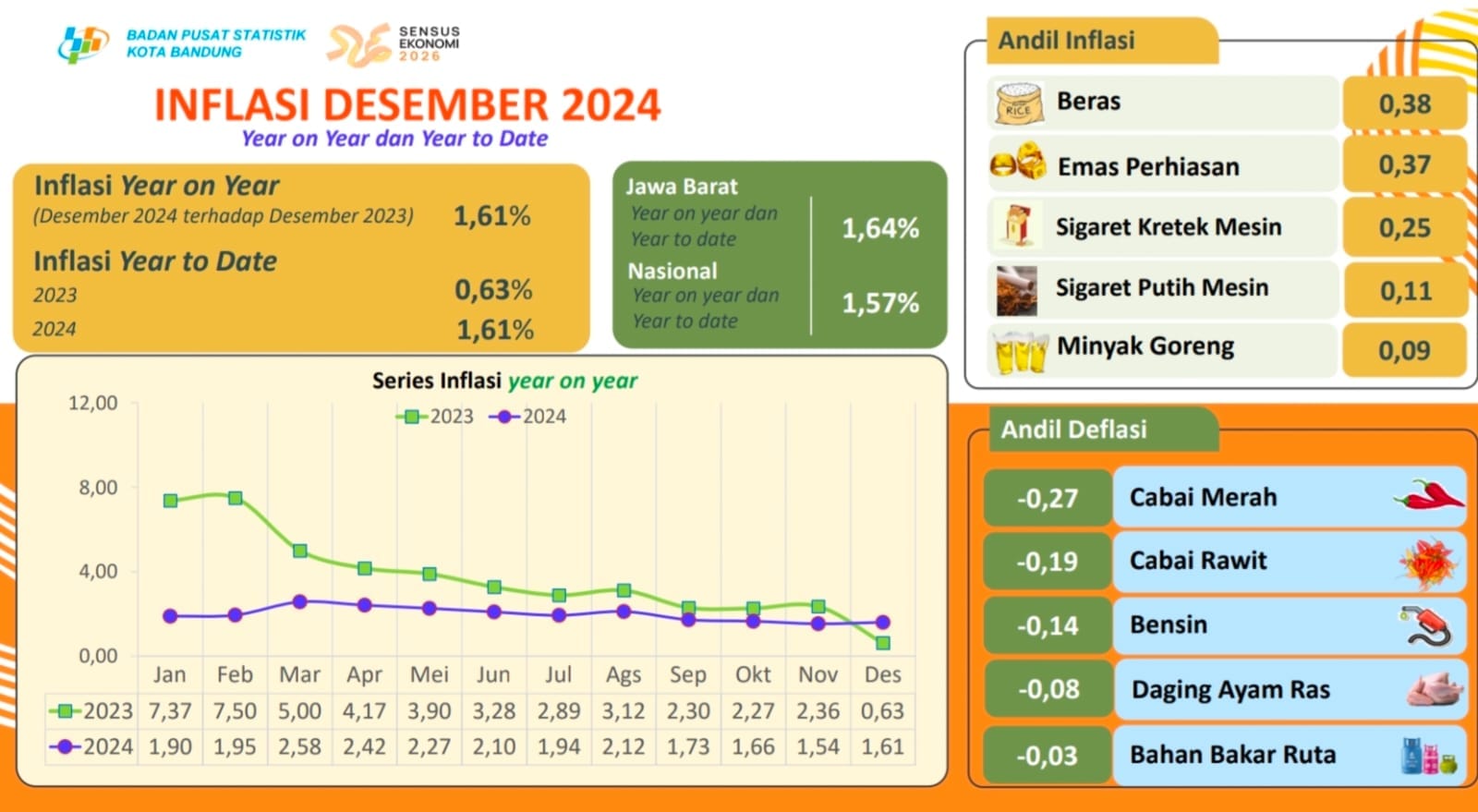 Sepanjang tahun 2024, inflasi year-to-date (ytd) Kota Bandung berada pada angka 1,61 persen, lebih rendah dibandingkan rata-rata Jawa Barat (1,64 persen). Hal ini menandakan Kota Bandung berhasil menjaga stabilitas ekonomi di tengah tekanan kenaikan harga pada komoditas seperti beras, emas perhiasan, dan tembakau yang menjadi penyumbang utama inflasi tahunan.