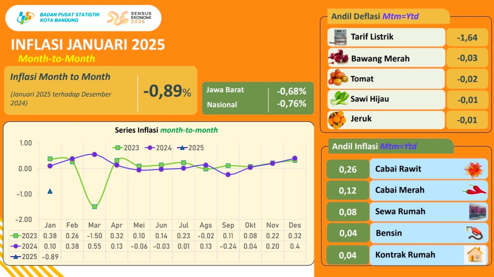 Hasilnya, pada Januari 2025, Kota Bandung mengalami deflasi month-to-month (m-to-m) sebesar -0,89%, lebih rendah dibandingkan rata-rata Jawa Barat (-0,68%) dan nasional (-0,76%). Secara year-on-year (y-o-y), inflasi tercatat sebesar 0,61%, lebih rendah dibandingkan Jawa Barat (0,79%) dan nasional (0,76%).