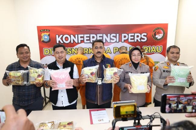 Breakingnewsbandung.com – PEKANBARU | Polda Riau melalui Subdit 3 Direktorat Reserse Narkoba (Ditresnarkoba) berhasil menggagalkan upaya pengiriman narkotika jenis sabu seberat 9,87 kilogram dan 30.000 butir pil ekstasi yang rencananya akan dikirim ke Palembang, Sumatera Selatan. Penyelidikan intensif selama hampir satu bulan akhirnya membuahkan hasil gemilang dengan diamankannya empat tersangka yang diduga terlibat dalam jaringan peredaran narkoba internasional.