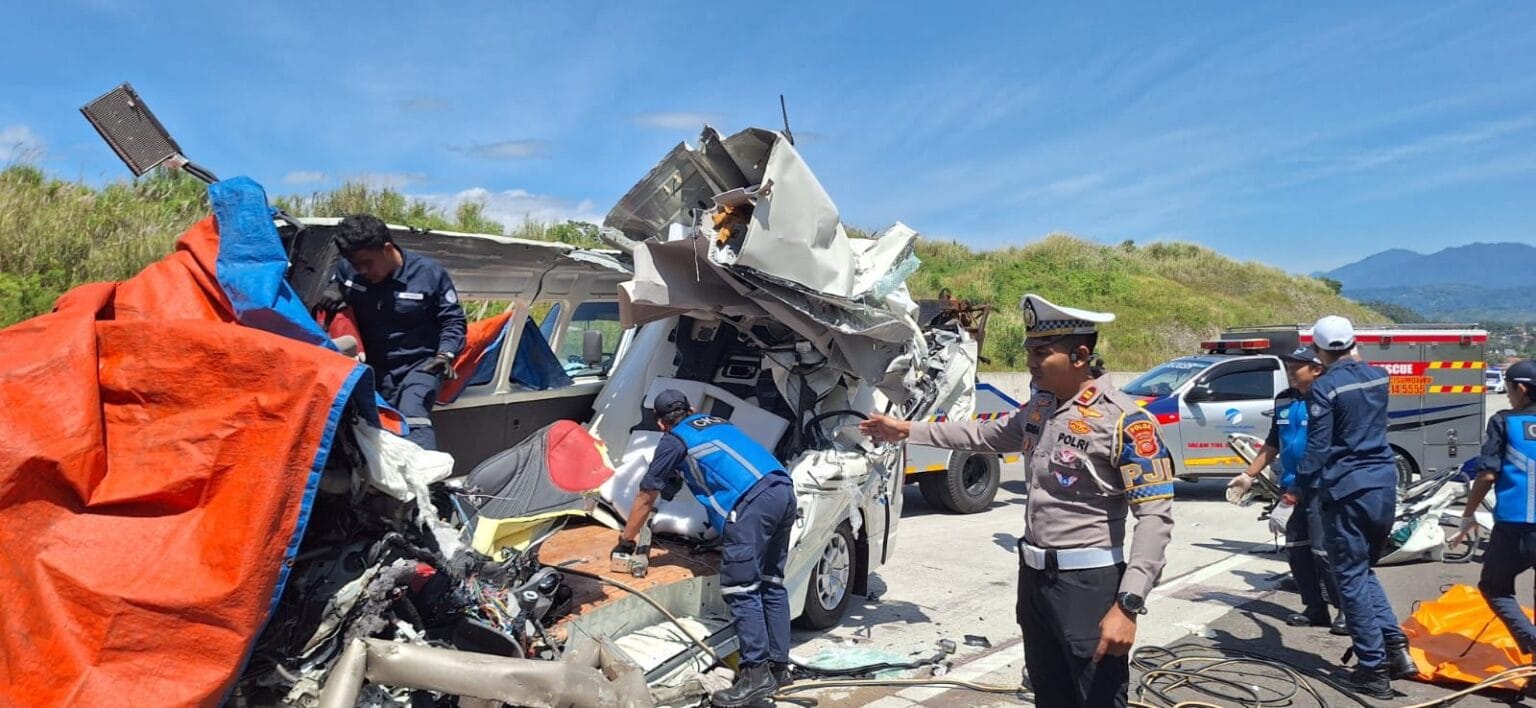 Breakingnewsbandung.com – SUMEDANG | Kapolres Sumedang, AKBP Joko Dwi Harsono, didampingi Wakapolres Kompol Sungkowo dan Kasat Lantas AKP Mochammad Ali, melakukan peninjauan langsung ke lokasi kecelakaan lalu lintas di Jalan Tol Cisumdawu Km 189.400, wilayah Mandala Herang, Kecamatan Cimalaka, Kabupaten Sumedang, Senin (29/4/2025). Kecelakaan tragis ini terjadi sekitar pukul 10.00 WIB dan melibatkan dua kendaraan, yaitu Toyota Hiace bernomor polisi D-7838-AV dan truk Hino Box dengan nomor polisi B-9652-TEZ. (Bandung, 29 April 2025)