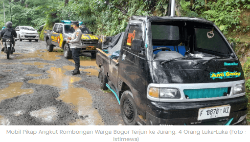 Breakingnewsbandung.com – BOGOR | Sebuah mobil pikap yang membawa rombongan warga terjun ke jurang di wilayah Desa Wargajaya, Kecamatan Sukamakmur, Kabupaten Bogor, Jawa Barat . Akibat insiden tersebut, empat orang dilaporkan mengalami luka-luka.