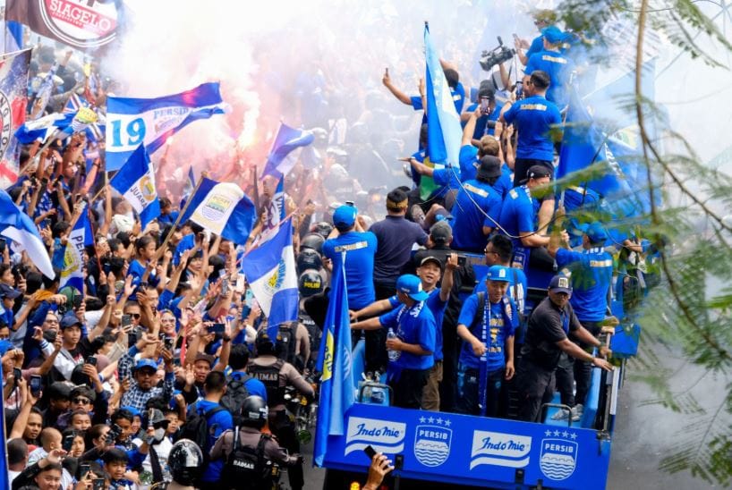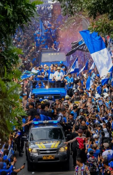 Generasi muda, keluarga, hingga warga lanjut usia tumpah ruah bersama dalam lautan biru, menyanyikan lagu-lagu dukungan untuk Persib. Di tengah riuhnya konvoi, semangat “Maung Bandung” seakan bergetar di seluruh penjuru kota.
